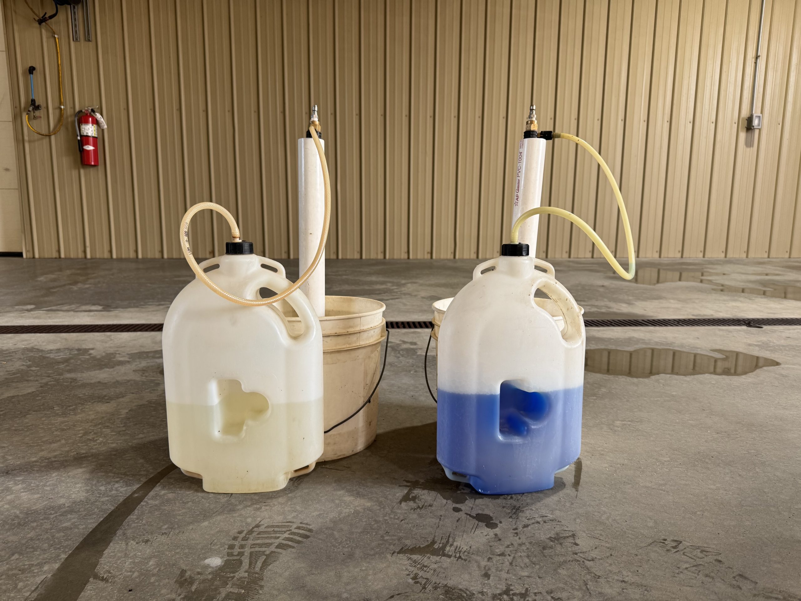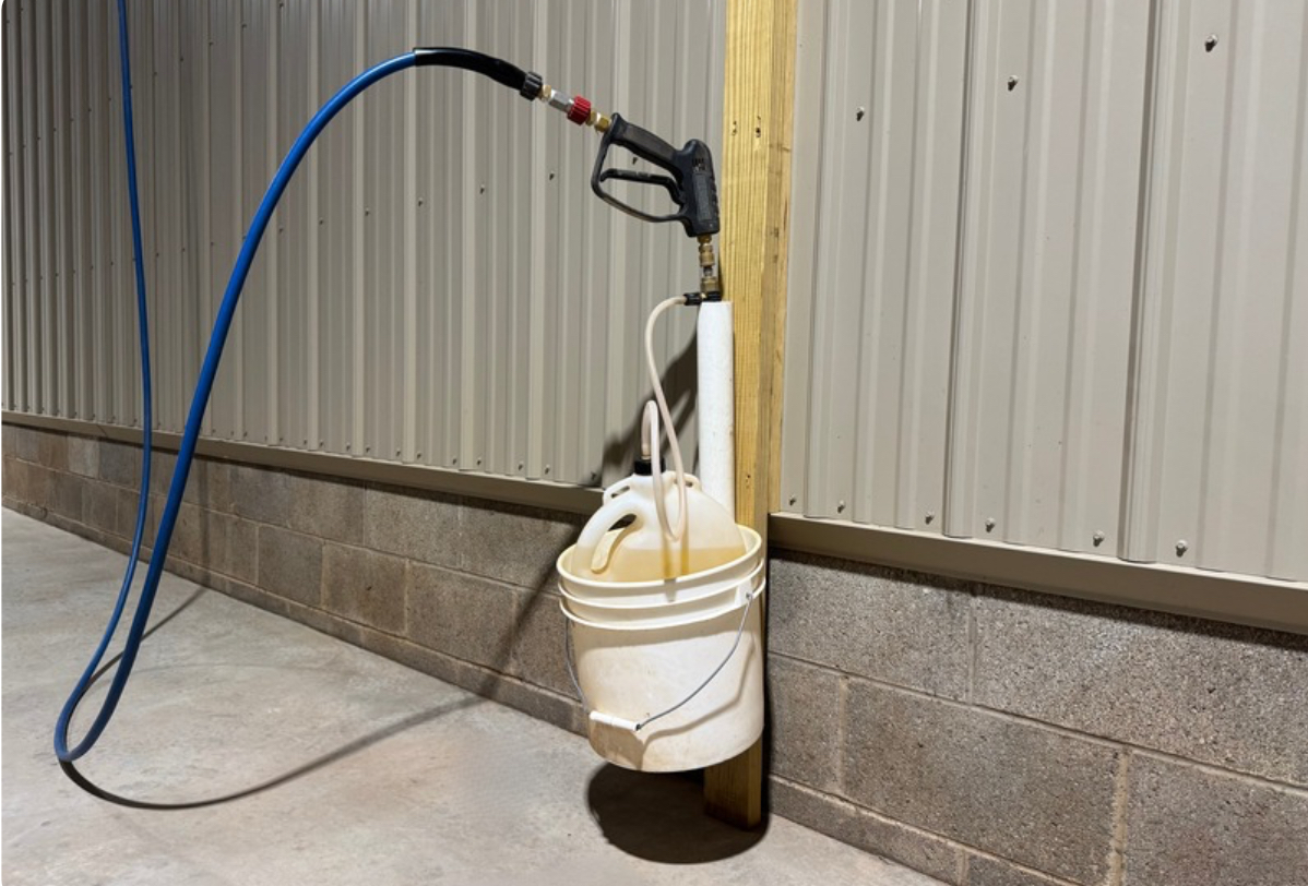 When not in use, pressure washers and disinfectant are kept off the ground and inside of a mounted bucket.
