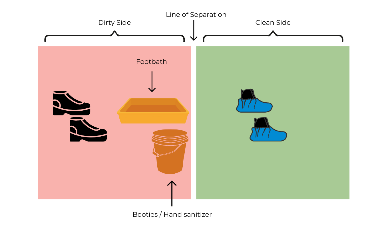 If it isn’t practical to use a Danish Entry System or pan of disinfectant to step in, we utilize a bucket with lid and a tray of foot powder. The bucket stores booties and hand sanitizer. Grab a pair of booties out of the bucket and use the bucket to sit on. As you put each booty over your shoes, place your foot down on the tray. Use hand sanitizer, then step out of the tray directly across your line of separation.