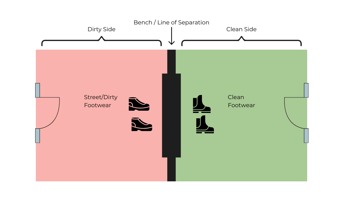 We use Danish Entry systems at critical lines of separation by utilizing a bench across an opening to prevent cross-contamination. A person has separate footwear on each side of the bench. As you take off your shoes on one side of the bench, you swing your legs over the bench to put on your other footwear. Never let your stocking feet touch the floor. Booties can also be put on, if you don’t have alternative footwear. It is a good idea to have hand sanitizer available after changing shoes.