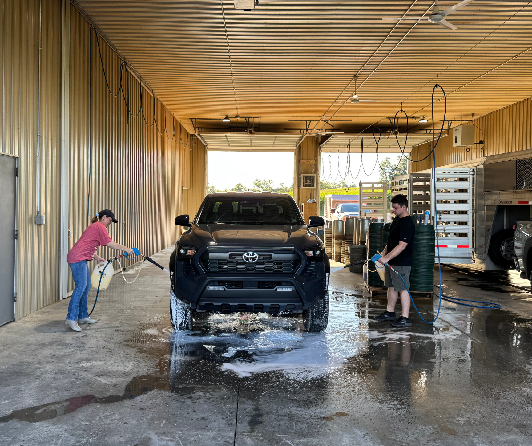 Equipment is sprayed down with a pressure washer. Each Pressure washer can be hooked up to disinfectant, soap, or water only.