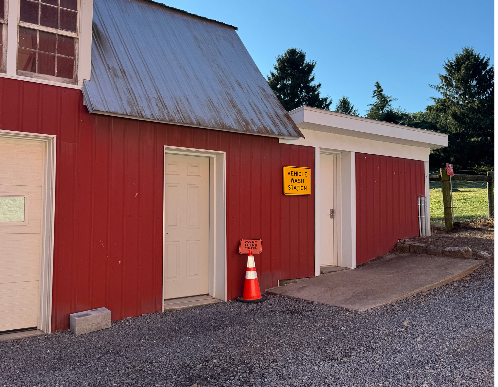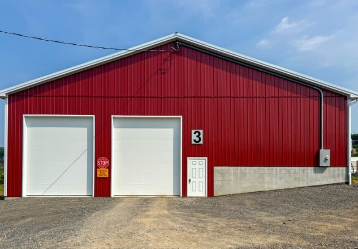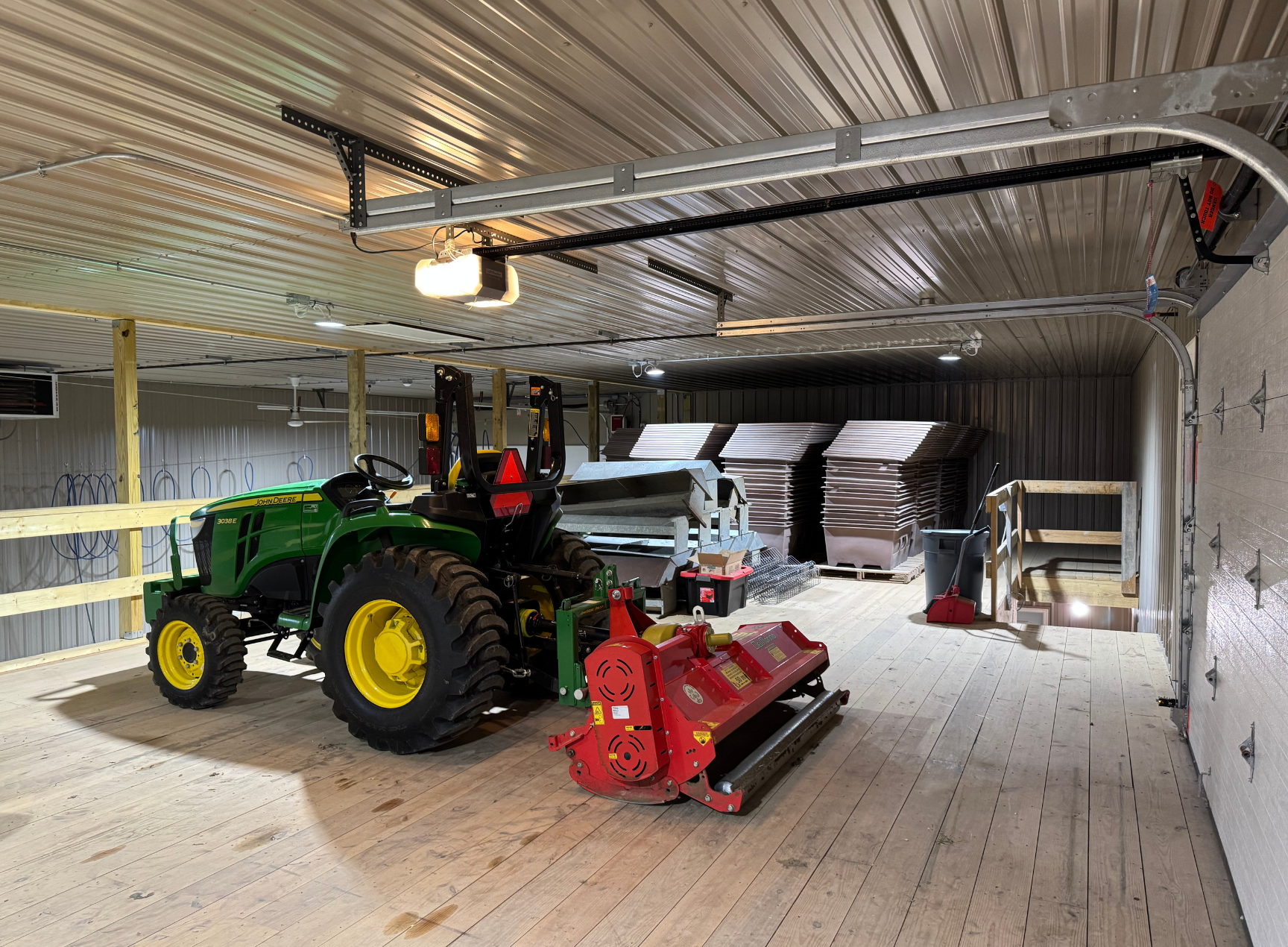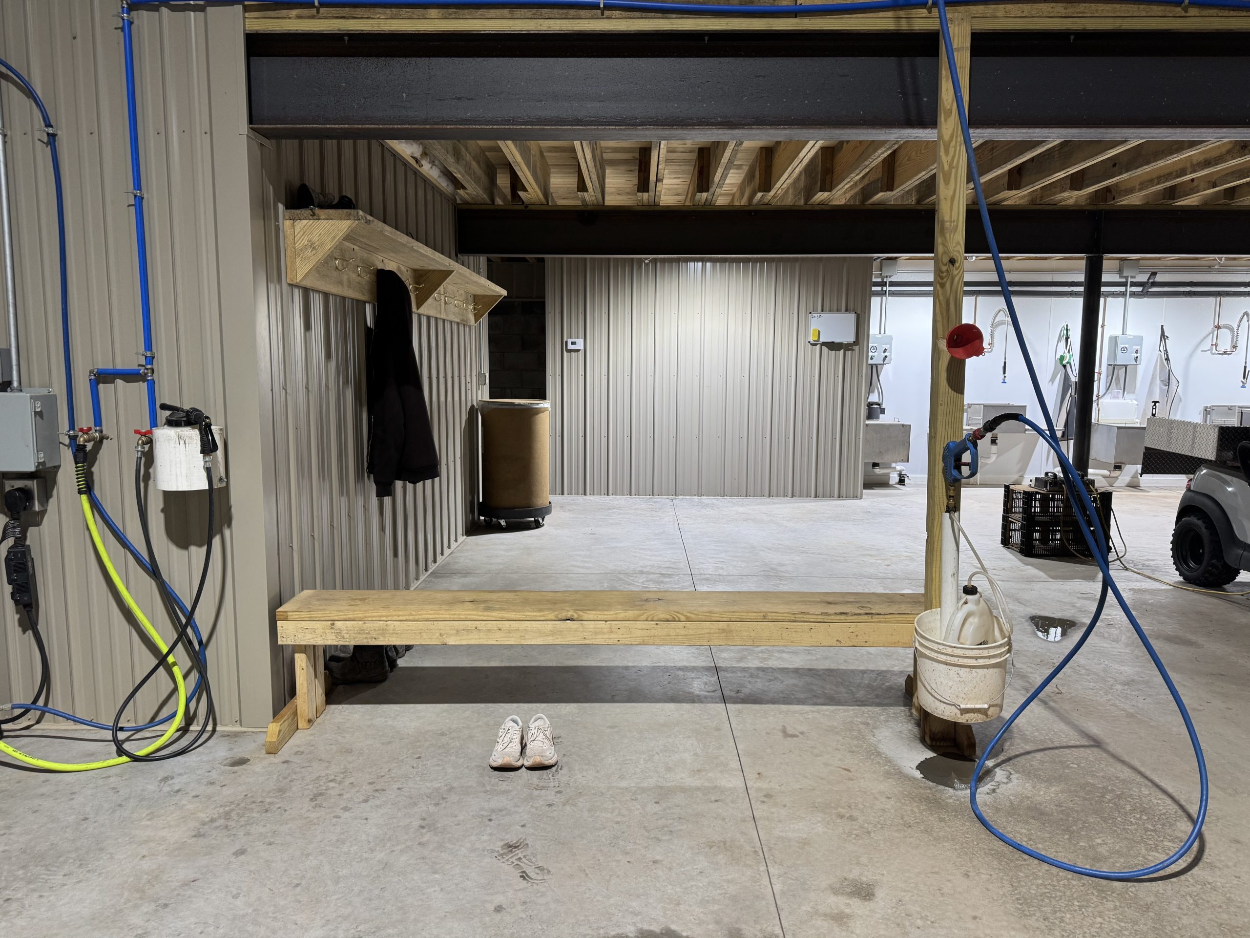 All equipment and machinery that is brought into the premise is disinfected using a pressure washer and spray foam. Pressure washer hoses are hung from the ceiling cables to increase mobility and longevity of the hose. After the item is done being disinfected it can continue out through a garage door on the opposite side of the building
