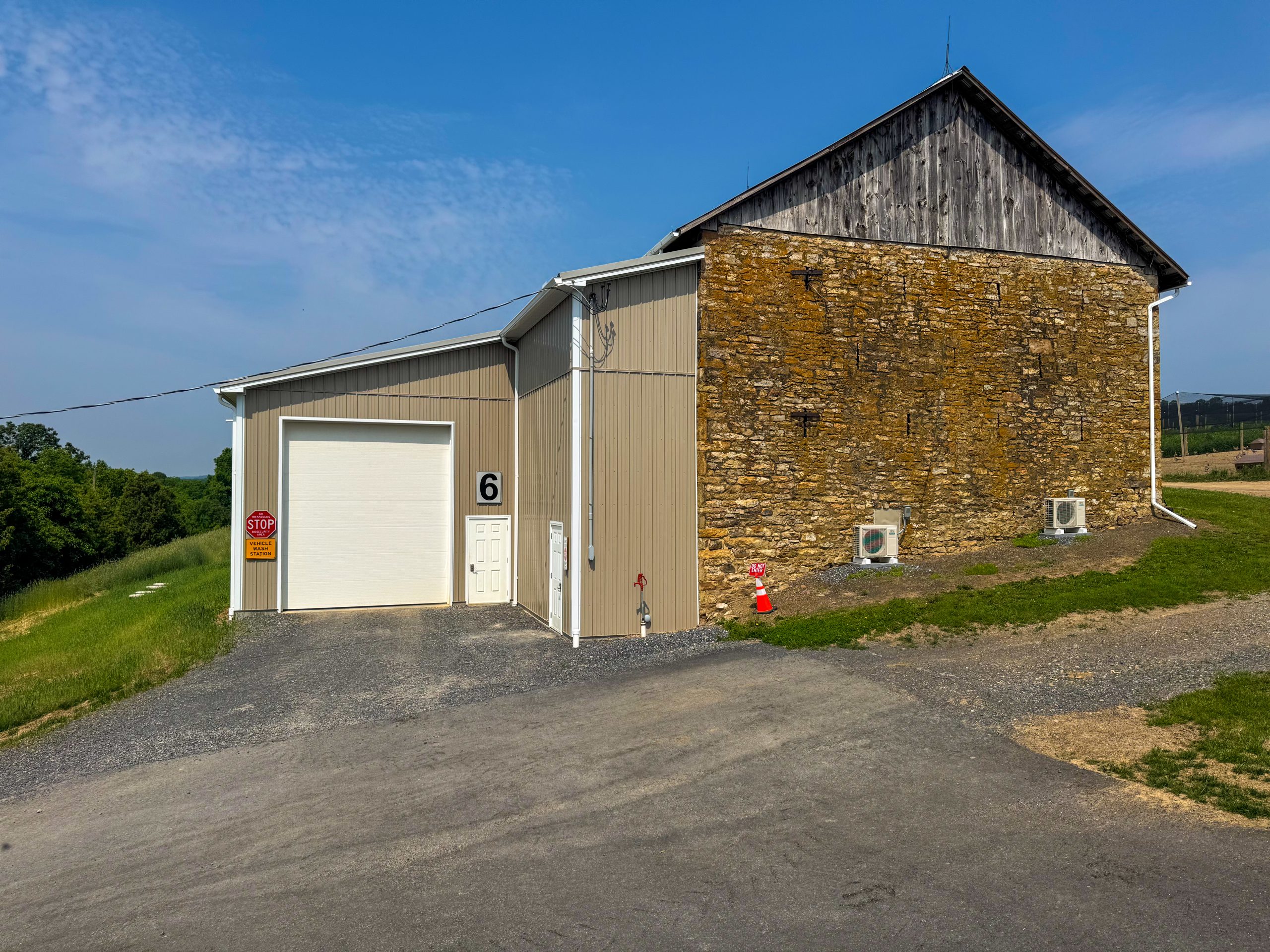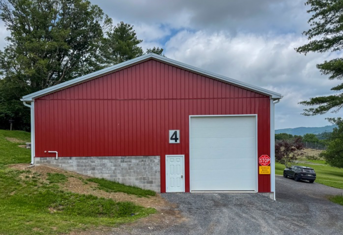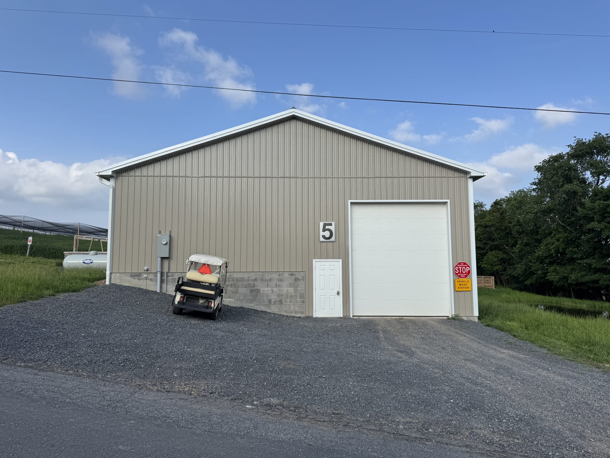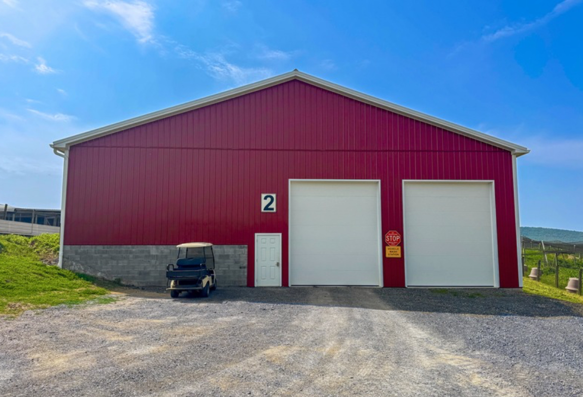 All equipment and machinery that is brought into the premise is disinfected using a pressure washer and spray foam. Pressure washer hoses are hung from the ceiling cables to increase mobility and longevity of the hose. After the item is done being disinfected it can continue out through a garage door on the opposite side of the building