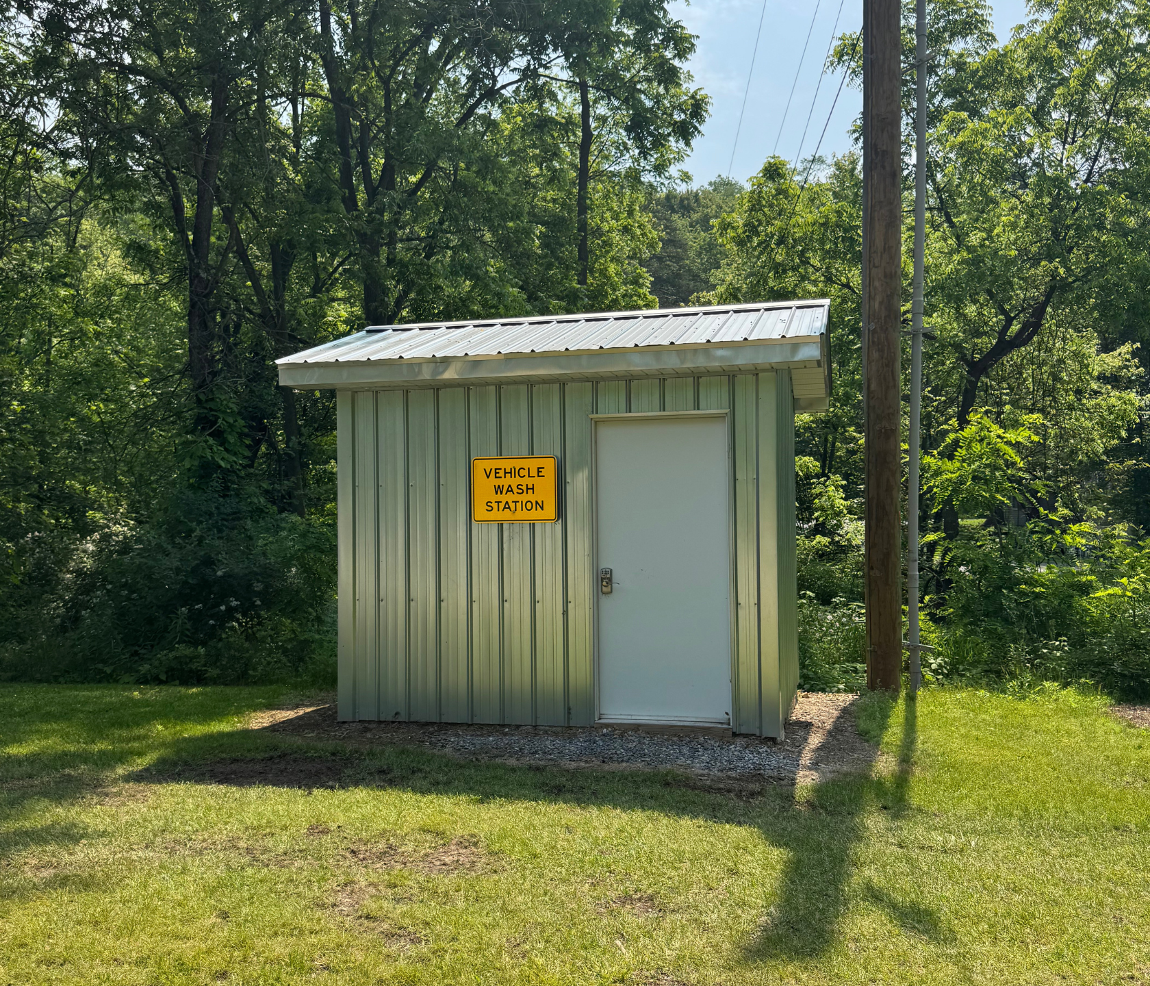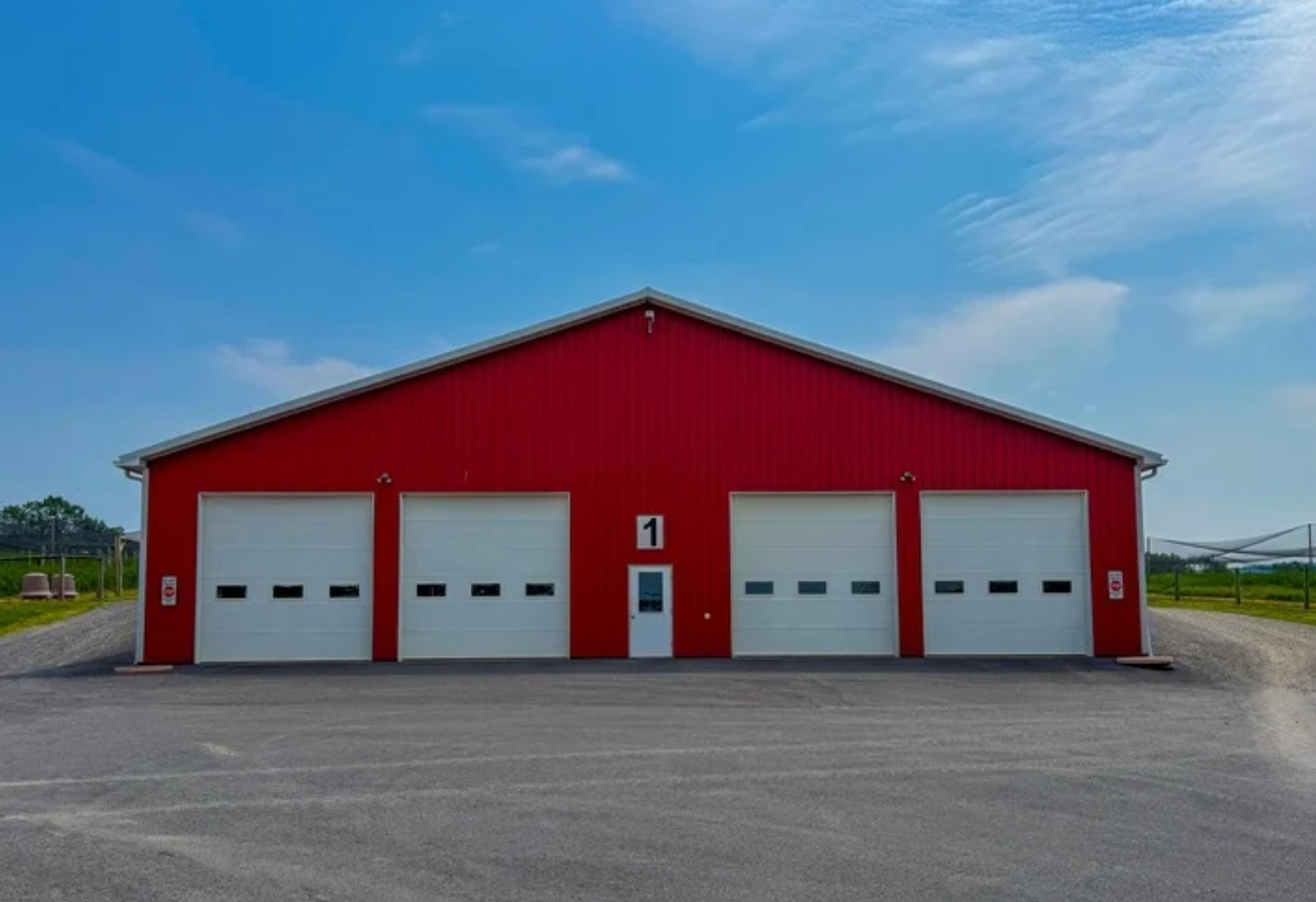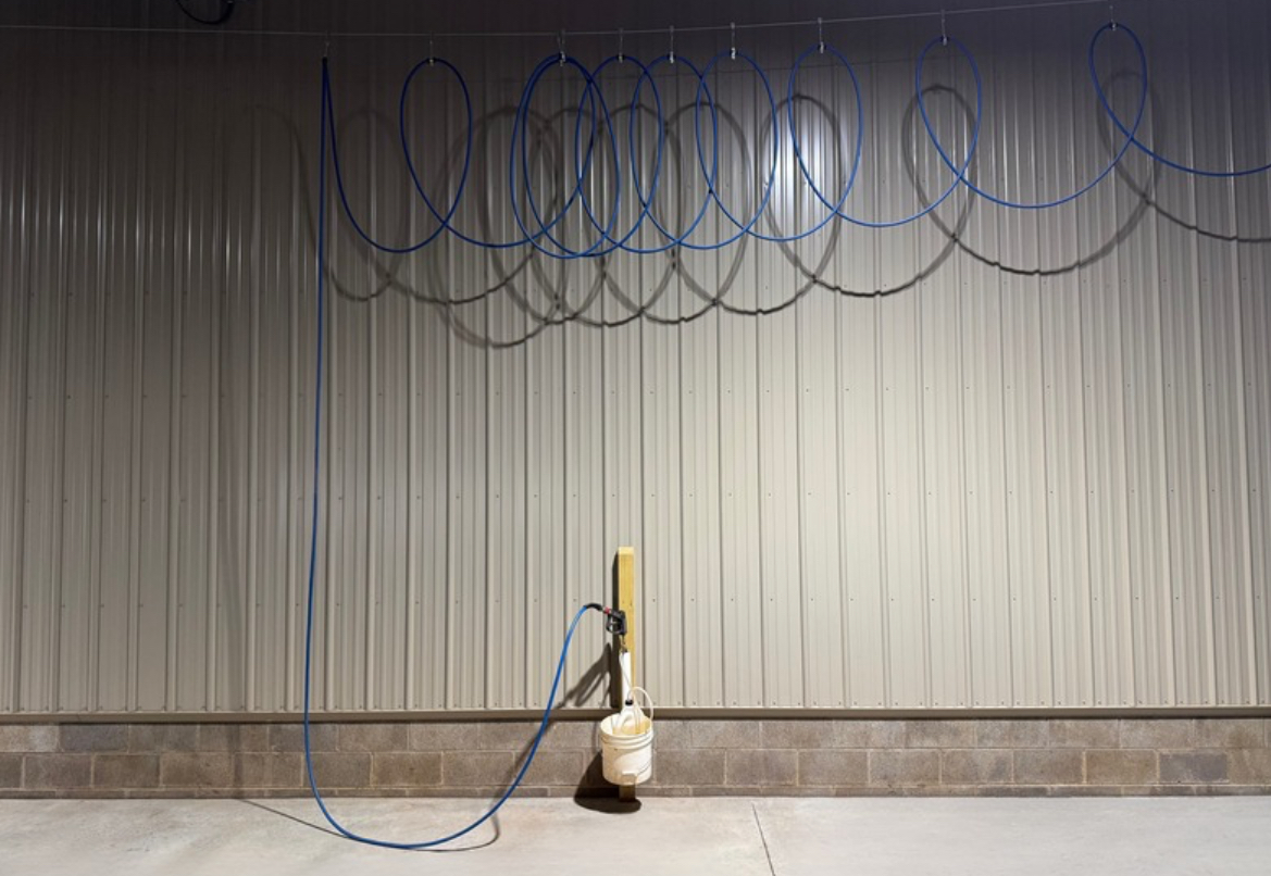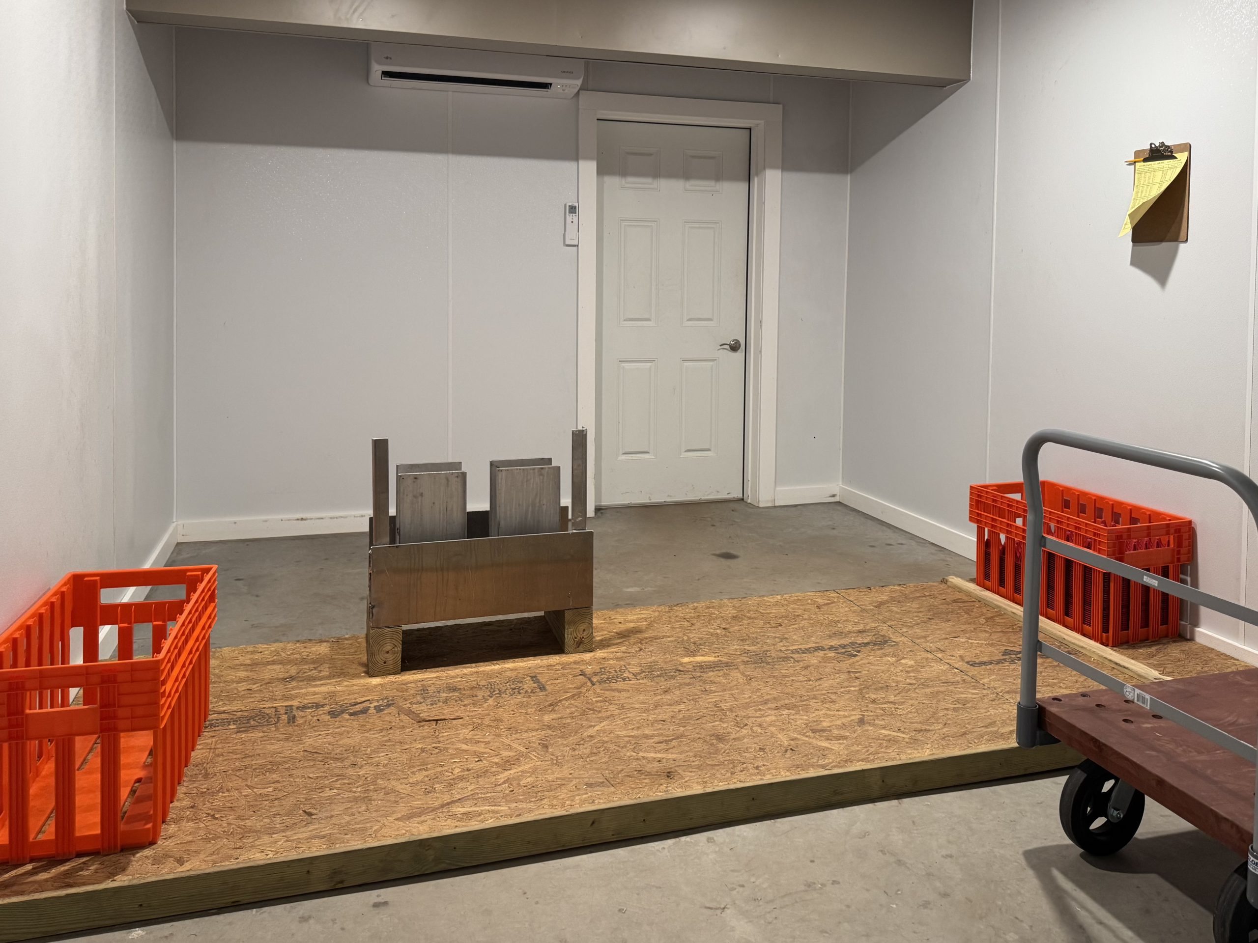 All equipment and machinery that is brought into the premise is disinfected using a pressure washer and spray foam. Pressure washer hoses are hung from the ceiling cables to increase mobility and longevity of the hose. After the item is done being disinfected it can continue out through a garage door on the opposite side of the building