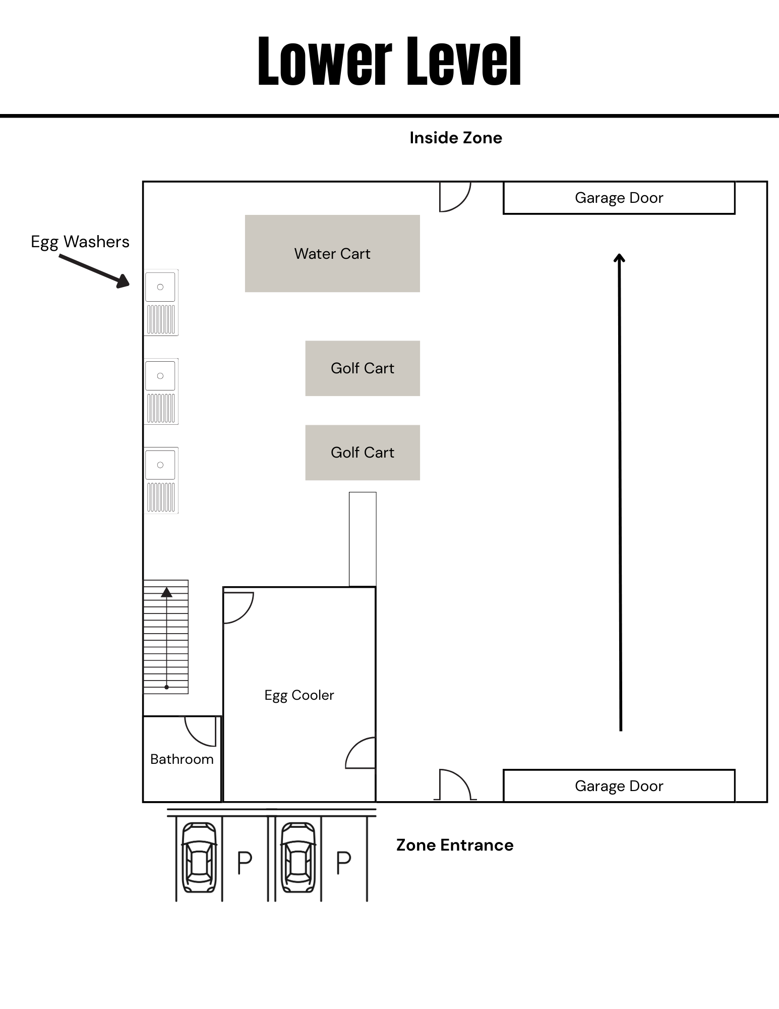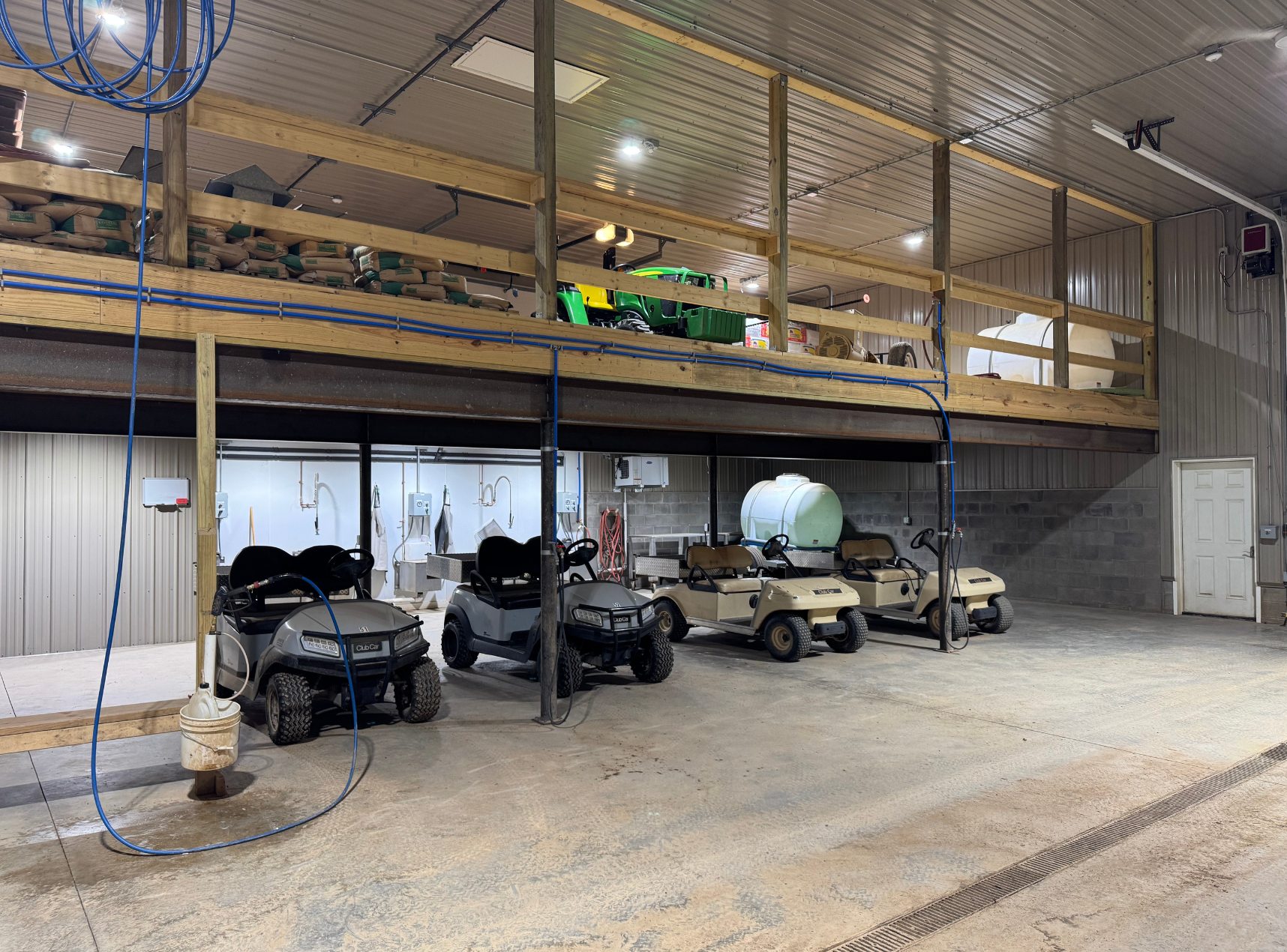 Equipment including golfcarts, water carts, and egg washers are stored on the lower level.